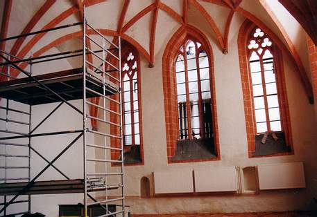 Schaut man in die Kapelle, ergibt sich ein prächtiger Anblick, vor allem wenn die Sonne durch die spitzbogigen Fenster scheint. Die Restauratoren haben hier im Wesentlichen ihre Arbeit getan, und auch die Bodenplatten sind komplett verlegt. Ihre Farbe korrespondiert mit dem „brillanten Ziegelrot“ der Kreuzrippen, aus denen das Gewölbe gebildet wird, wie Restaurator Jörg Breitenfeldt sagt. Dieser Farbton aus der Zeit um 1520 wurde nach Entfernung dicker Farbschichten nachgewiesen und neu aufgetragen. Er verleiht dem zu neuem Leben erweckten Raum eine großartige Feierlichkeit. Nur noch in Resten haben Breitenfeldt und seine Kollegen Ausmalungen zwischen den Kreuzrippen der Decke gefunden. Bis zu zwölf Lagen dicker Tünche mussten Millimeter für Millimeter abgetragen werden, mal mit feuchten Kompressen, mal mit dem Skalpell oder auch - wie beim Zahnarzt - mit feinen Ultraschallgeräten. Für alle überraschend traten Reste einer Himmelswiese hervor - Blumen, Blüten und Blätter.