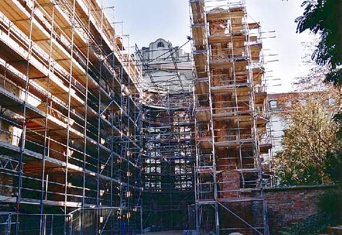 Die zur Zeit eingerüsteten Mauern der Klosterkirche