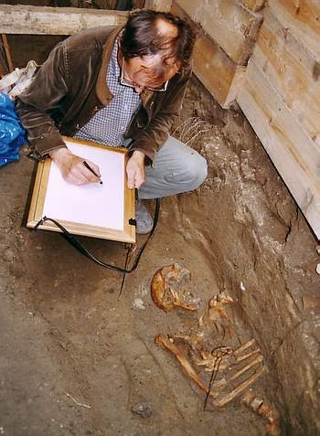 Das Gemäuer im Chorbereich der Nikolaikirche im Herzen des alten Berlin muss saniert werden. Doch bevor sich die Maurer ans Werk machen können, rücken die Archäologen vom Landesdenkmalamt an und gehen in den Boden. Vor der Chormauer haben sie Überreste von zahlreichen Toten in einer Tiefe bis zu drei Metern gefunden. Die Grabstätten gehören zu einem Friedhof, der erst im frühen 18. Jahrhundert aufgegeben wurde. Die dicht übereinander geschichteten Gräber schmiegen sich eng an die gebogene Chorwand an und lassen einen Blick in die frühe Geschichte der Stadt zu. „Nach unseren Berechnungen könnten allein auf diesem Fleck etwa 400 Bestattungen liegen. Das deutet auf drangvolle Enge hin und wirft ein interessantes Licht auf wenig komfortable Lebensverhältnisse im alten Berlin“ sagt der Archäologe Uwe Michas, der auch Ausgrabungen in der Marienkirche und in der Klosterkirche betreut. Da und dort deuten Verfärbungen im Boden auf Bestattungen in Särgen. Sie sind schon längst vergangen, lediglich eiserne Griffe erinnern noch an sie.
