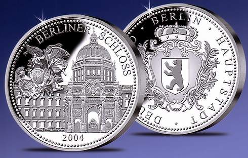 In diesen Tagen erscheint eine in der Münze Berlin, kenntlich an unseren Geldstücken durch den Buchstaben A, geprägte Silbermedaille mit der Ansicht des Berliner Schlosses, deren Verkaufserlös seinen Wiederaufbau unterstützen soll. Die Auflage beträgt 100 000 Exemplare und der Verkaufspreis zehn Euro. Davon fließen 2,5 Euro dem Förderverein Berliner Schloss e. V. zu. Deren Geschäftsführer Wilhelm von Boddien hofft, mit dem Verkauf der von Katharina Naudszus geschaffenen Prägung etwa in der Infobox auf dem Schlossplatz und an anderen Stellen, aber auch über die MDM Münzhandelsgesellschaft in Braunschweig und andere Händler 250 000 Euro zusammen zu bekommen. Damit könnte man die Bildhauerarbeiten einer senkrechten Fensterachse des Schlosses vom Dach bis zum Erdboden bezahlen.