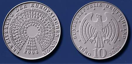Die neue 10-Euro-Münze anlässlich der Erweiterung der Europäischen Union (EU) wurde von dem Designer Aase Thorsten gestaltet. Sein Entwurf besteht aus einer kreisförmigen Schriftlösung, die die in die EU eintretenden Staaten in ihrer Landessprache nennt. Dazu kommen Daten für das Zusammenwachsen unseres Kontinents zwischen 1950 und 2004. Die Umschrift FREUDE SCHÖNER GÖTTERFUNKEN stammt aus Schillers „Ode an die Freude“, die Ludwig van Beethoven im letzten Satz der IX. Sinfonie vertont hat. Sie wurde 1972 vom Europarat zur offiziellen Hymne der EU gekürt. Anlässlich des 200. Geburtstages des Dichters Eduard Mörike am 8. September 2004 bringt Deutschland eine silberne Gedenkmünze zu 10 Euro nach einem Modell von Erich Ott heraus, das den Balladendichter, Erzähler und Übersetzer im Halbprofil dargestellt. Die Randschrift zitiert Mörike mit den Worten OHNE DAS SCHÖNE WAS SOLL DER GEWINN.