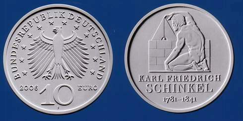 Karl Friedrich Schinkel (1781-1841) war weitaus mehr als Preußens oberster Baumeister und Stadtplaner in der ersten Hälfte des 19. Jahrhunderts. Am 13. März 1781 in Neuruppin als Sohn eines Geistlichen geboren, aber in Berlin aufgewachsen und ausgebildet, glänzte der vielseitige Künstler auch als Maler, Designer und Denkmalpfleger, Kunstgewerbler und Bühnenbildner. Diesem Universalkünstler ist eine silberne 10-Euro-Münze gewidmet, die 2006 zu seinem 225. Geburtstag erscheint.Fast alle Teilnehmer eines künstlerischen Wettbewerbs für die neue Gedenkmünze reichten Entwürfe mit Schinkels markantem Konterfei ein. Es ist uns durch Denkmäler in Berlin und Neuruppin sowie durch Büsten, Gemälde und Grafiken bekannt und ist auch auf Medaillen, einem Zehnmarkstück der früheren DDR von 1966 und einer 1936 gedruckten Banknote zu 1000 Reichsmark, die aber erst 1944 ausgegeben wurde, überliefert.