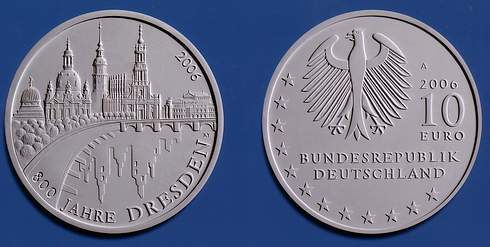Anlässlich der Achthundertjahrfeier der sächsischen Landeshauptstadt Dresden erscheint demnächst eine neue Zehn-Euro-Münze. Aus einem Wettbewerb für die Gestaltung der Silberprägung mit der Jahreszahl 2006, an dem 15 Künstlerinnen und Künstler teilnahmen, ging der Berliner Münzdesigner Heinz Hoyer als Sieger hervor. Sein Entwurf zeigt die berühmte, jetzt auch durch den Wiederaufbau der Frauenkirche vervollständigte Silhouette der Stadt, von der Elbe aus gesehen. Die Türme spiegeln sich im Fluss, doch wenn man genau hinschaut, erkennt man nur die Ruinen prominenter Gebäude, die beim Bombenangriff auf das barocke „Elbflorenz“ im Februar 1945 stehen geblieben sind. Zu erkennen sind, von links beginnend, die Kuppel der Kunstakademie, die Frauenkirche, der Schlossturm, die Kathedrale (Hofkirche) und rechts außen die Semperoper. Dem Künstler sei es in hervorragender Weise gelungen, „mit der Spiegelung im Fluss Wiederaufbau und Zerstörung der Stadt, die Teile des Mythos von Dresden sind, greifbar in das Münzrund einzubeziehen“, stellte die Jury fest und fügte hinzu, der Adler auf der Wertseite sei künstlerisch gelungen und harmoniere mit der Bildseite.