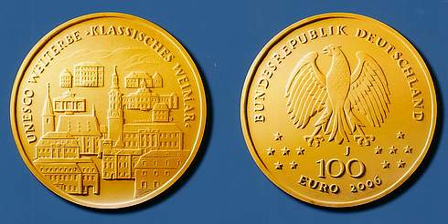 In der Serie von deutschen Goldmünzen zu 100 Euro erscheint 2006 eine Ausgabe, die der Klassikerstadt Weimar gewidmet ist. Diese steht auf der Unesco-Liste des Weltkulturerbes und zeichnet sich durch eine Fülle von Wohn- und Erinnerungsstätten an Goethe, Schiller, Herder, Wieland, Liszt und andere bedeutende Persönlichkeiten aus. In die Schlagzeilen geriet die ehemalige herzogliche Residenzstadt durch den Brand der Anna-Amalia-Bibliothek, bei dem zahlreiche wertvoll Bücher und Handschriften unwiederbringlich verloren gingen und ein wertvolles Gebäude aus dem 18. Jahrhundert weitgehend zerstört wurde.