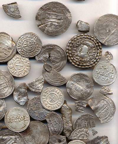Ausgrabungen haben reichhaltiges Material über die offensichtlich recht innovativen und schlagkräftigen „Genies aus der Kälte“, wie man die Wikinger gelegentlich nannte, zutage gefördert, und einen kleinen Ausschnitt dieser einzigartigen Hinterlassenschaft bietet der vorliegende Band. Es handelt sich um Grabfunde, Schmuck, Waffen, Werkzeuge und Alltagsgegenstände, dazu kommen tausendjährige Schiffswracks und mit geheimnisvollen Zeichen bedeckte Inschriftensteine. Von numismatischem Interesse sind einige in dem Buch vorgestellte Schatzfunde, in denen Gegenstände aus Gold und Silber sowie Münzen vereint sind. Solche Horte hat man in den Siedlungsgebieten der Wikinger entdeckt, nicht aber in jenen Gegenden, in die sie zu ihren Raubzügen einfielen, um dann schnell wieder zu verschwinden. Bis vor wenigen Jahren hat man in der Rheingegend, an Maas und Schelde dergleichen nicht entdeckt. Die Wende kam, so ist zu erfahren, als ein Hobbyarchäologe vor fast zehn Jahren mit Hilfe seines Metalldetektors auf der ehemaligen Insel Wieringen im Norden der Provinz Nordholland fündig wurde. Der aus Silberschmuck, -barren und –münzen bestehende Hort war in einem Tontopf verborgen und wog 1662 Gramm. 1999 und 2001 stieß man nicht weit vom ersten Fundort auf weitere Objekte dieser Art. Die Münzen setzten sich überwiegend aus karolingischen Denaren sowie arabischen Dirhams zusammen, die zum Teil zerschnitten sind, um sie hinsichtlich ihres Gewichts den kleineren Denaren anzupassen. Beachtenswert sind Preisvergleiche. Für ein Gramm Silber bekam man im neunten Jahrhundert zehn Hühner, für zwölf einen Mantel, für 100 und mehr eine Kuh und für 410 Gramm einen Helm. 820 Gramm Silber mußten hingelegt werden, um ein Kettenhemd zu erstehen. Wenn das Buch hier auch noch die Quelle für diese bemerkenswerte Aufstellung mitgeteilt hätte, die etwas über die hohe Wertschätzung von Wehr und Waffen bei den Wikingern aussagt, wäre die Information perfekt gewesen.