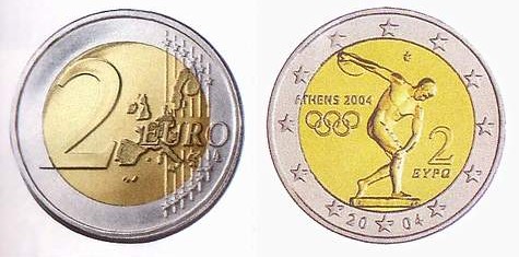 Einige zum Euro-Bereich gehörende Länder haben sich entschlossen, ergänzend zu den 2002 eingeführten Werten zu zwei Euro neue herauszubringen. Den Anfang machte im vergangenen Jahr Griechenland, das anlässlich der Olympiade in Athen im August 2004 ein neues Motiv prägen ließ. Dargestellt ist statt der Europa auf dem Stier nach einem antiken Vasenbild ein Diskuswerfer. Das Geldstück kam in einer Startauflage von 49,5 Millionen Exemplaren heraus, dürfte also auch in unseren Portemonnaies zu finden sein, da es im ganzen EU-Bereich offizielles Zahlungsmittel ist. Die Ausgabe wird viele Sammler freuen. Das Bild belebt sich, auch werden neue Informationen auf numismatischem Weg über das Geburtsland der Olympischen Spiele vermittelt.