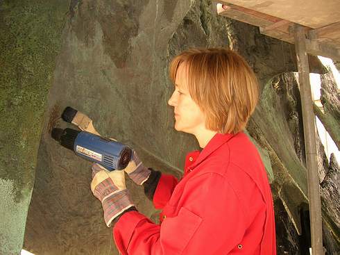 Auf dem Ernst-Reuter-Platz in Charlottenburg ist die Metallrestauratorin Betina Ross dabei, eine riesige Bronzeskulptur, die „Flamme“ des Bildhauers Bernhard Heiliger, zu reinigen und zu konservieren. Seit der Aufstellung im Jahre 1963 hat sich Straßendreck aller Art auf dem grün patinierten Metall abgelagert, und außerdem haben sich durch Erschütterungen, innere Spannungen und Temperaturschwankungen in dem Metall feine Haarrisse gebildet.