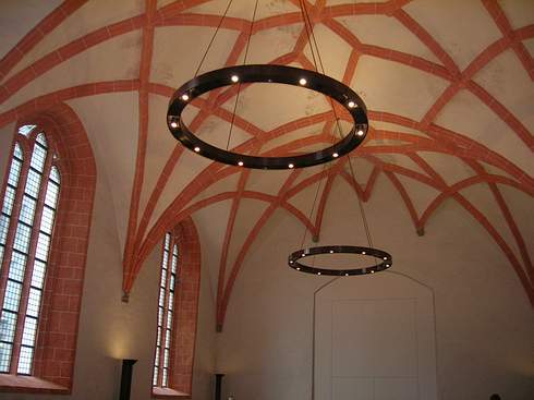 Betritt man die Kapelle, so ergibt sich ein prächtiger Anblick, vor allem wenn die Sonne durch die spitzbogigen Fenster scheint. Die Farbe der Bodenplatten korrespondiert mit dem „brillanten Ziegelrot“ der Kreuzrippen, aus denen das Gewölbe gebildet wird, wie Restaurator Jörg Breitenfeldt sagt. Dieser Farbton aus der Zeit um 1520 wurde nach Entfernung dicker Farbschichten nachgewiesen und neu aufgetragen. Nur noch in Resten haben Breitenfeldt und seine Kollegen Ausmalungen zwischen den Kreuzrippen der Decke gefunden. Bis zu zwölf Lagen dicker Tünche mussten Millimeter für Millimeter abgetragen werden, mal mit feuchten Kompressen, mal mit dem Skalpell oder auch - wie beim Zahnarzt - mit feinen Ultraschallgeräten. „Die zutage getretene Himmelswiese mit Blumen, Blüten und Blättern sucht in Berlin ihresgleichen. Die Ornamente lassen ahnen, wie farbenfreudig und vielgestaltig der Raum vor einem halben Jahrtausend ausgemalt war“, sagt Breitenfeld. Manch einer würde es gern sehen, wenn diese Reste bunt nachgemalt und phantasievoll ergänzt würden, doch würde das denkmalpflegerischen Grundregeln widersprechen. Eine andere Kostbarkeit sind die spätgotischen Konsolen, auf denen die Kreuzrippen ruhen. Diese Auflagen aus gebranntem Ton stellen Gottvater, Maria, Jesus Christus und die Apostel dar und belegen die hohe Kunstfertigkeit und Dekorationsfreude, die man bei der Ausgestaltung der Kapelle an den Tag legte. Und noch eine Attraktion ist zu sehen. Dafür aber muss man ins zweite Obergeschoss der aus der Kaiserzeit stammenden und heute von den Wirtschaftswissenschaftlern genutzten Handelshochschule gehen. Hier sind in eine Wand zwei Fenster eingelassen. Durch sie schaut man auf den weitgehend noch original erhaltenen Dachstuhl der Heiliggeistkapelle. Für die Architektin Ursula Hüffer grenzt es an ein Wunder, dass die komplizierte Holzkonstruktion, deren Bestandteile nach einem dendrochronologischen Verfahren exakt auf das Jahr 1476 datiert werden kann, alle Stürme der Zeit überstanden hat.