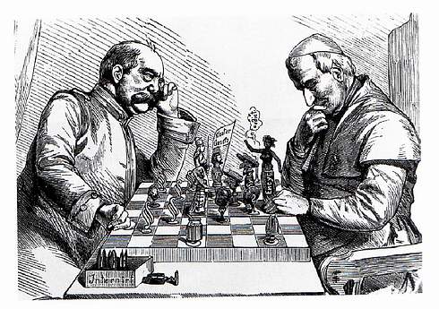 BU: Bismarck „schachert“ mit dem Papst um Rechte und Pflichten. Karikatur aus dem Kladderadatsch 1875. Repro: Caspar