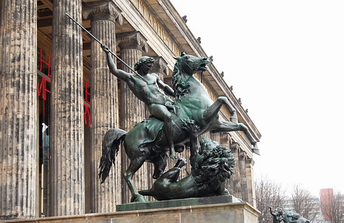 Das Alte Museum, Karl Friedrich Schinkels berühmter Säulenbau am Lustgarten, hat seinen prächtigen Treppenschmuck aus Bronze zurück bekommen. Monatelang wurde der repräsentative Aufgang zu dem 1830 eingeweihten Museum saniert, wobei der Zugang nur über Behelfstreppen aus Holz möglich war. Zeitgleich haben Metallrestauratoren die beiden monumentale Figurengruppen aus Bronze auf den seitlichen Treppenwangen repariert und gereinigt. Linkerhand erwehrt sich ein 1837 bis 1842 vom Bildhauer August Kiß geschaffener Reiter eines Löwen, und rechts wird eine 1854 bis 1861 von Albert Wolff nach einem Entwurf von Christian Daniel Rauch modellierte Amazone ebenfalls hoch zu Ross von einem Panther angegriffen. Wütend versucht sie, das Untier mit einem Speer niederzustrecken. Ob sie gewinnt, lässt die Skulptur nicht erkennen.