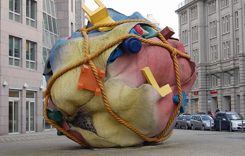 Die Künstler Claes Oldenburg und Coosje van Bruggen ließen sich bei ihrem „Houseball“ (Hausball) von einem Relief auf dem Sockel eines 1912 enthüllten Bronzedenkmals dieses Monarchen im Böhmischen Dorf in Rixdorf, dem heutigen Neukölln, inspirieren. Dort trägt eine Frau ihre Habseligkeiten, zu einem Bündel geschnürt, auf dem Rücken. Das überdimensionierte Fluchtgepäck besteht aus Kunststoffmaterial und enthält allerhand Hausrat und Möbel. Es markiert jenen Platz, auf dem Friedrich Wilhelm I. die Böhmische Bethlehemskirche für die Einwanderer hatte errichten lassen. Im Zweiten Weltkrieg zerstört, wurde die Kirchenruine 1963 beseitigt. Ihre in das Straßenpflaster eingelassenen Umrisse erinnern am ehemaligen Standort an das unscheinbare Gotteshaus für die Zuzügler, die sich nicht nur im damaligen Rixdorf, sondern auch in der preußischen Haupt- und Residenzstadt Berlin niederlassen durften und von den Hohenzollernkönigen mit manchen Privilegien ausgestattet wurden.