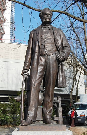 Der Industrielle und Ingenieur Werner von Siemens (1816-1892) war und ist in Berlin eine populäre Persönlichkeit. Vor der Technischen Universität Berlin (TUB) hält er, in Bronze gegossen, neuerdings Wache. Als 1899 die damalige Technische Hochschule Charlottenburg ihr hundertjähriges Bestehen feierte, wurde das Siemens-Denkmal mit dem des Kanonenkönigs Alfred Krupp (1812-1887) vor dem Hauptgebäude der Bildungs- und Forschungseinrichtung an der heutigen Straße des 17. Juni aufgestellt. Der Bildhauer Wilhelm Wandscheider zeigt den Erfinder und Fabrikanten elektrischer Geräte überlebensgroß und stehend; seine rechte Hand stützt sich auf den von ihm erfundenen Dynamomaschine, die hinter ihm aufgestellt ist.