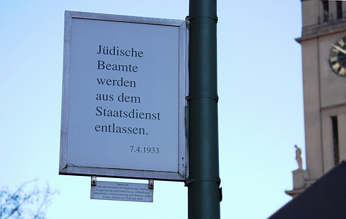 Die schrittweise Entrechtung nach der Errichtung der NS-Diktatur am 30. Januar 1933 und dann verschärft im Ergebnis der Nürnberger Rassegesetze von 1935 betraf alle Lebensbereiche und erstreckten sich von der Entlassung jüdischer Beamter aus dem Staatsdienst über das Verbot des gemeinsamen Spiels von „arischen“ mit „nichtarischen“ Kindern und die Anordnung, wonach Juden ihre Wohnungen nach 8 Uhr abends („im Sommer 9 Uhr“) nicht mehr verlassen dürfen bis zur Ablieferungspflicht von Rundfunkapparaten. Juden wurden Sitzplätze auf Parkbänken verweigert; sie durften Lebensmittel nur noch zu bestimmten Zeiten, nämlich zwischen 14 und 15 Uhr, einkaufen. Für sie bestand seit Oktober 1941 ein Auswanderungsverbot, und schon bald wurden sie in die Konzentrations- und Vernichtungslager verschleppt. Auf einer dieser Tafeln ist ein Augenzeugenbericht von 1939 zu lesen, wonach Juden am Bayerischen Platz nur die gelb markierten Sitzbänke benutzen dürfen, auf einer anderen Tafel stehen diese letzten Worte: „Nun ist es soweit, morgen muß ich fort... u. das trifft mich natürlich sehr schwer... Ich werde Dir schreiben“.