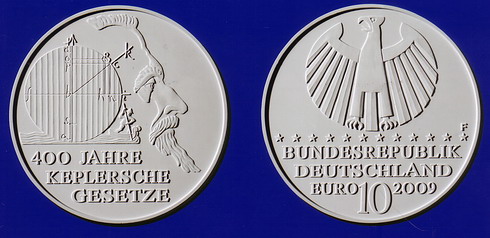 Sammler von Münzen mit Bildnissen berühmter Gelehrter und zu wissenschaftlichen Themen können sich auf zwei deutsche Zehn-Euro-Prägungen freuen, die für 2009 angekündigt sind. Die eine würdigt die Gründung der Leipziger Universität vor 600 Jahren, die andere ist der Veröffentlichung des berühmten Werks ASTRONOMIA NOVA von Johannes Kepler vor 400 Jahren gewidmet. In dem Buch hatte der 1571 in Regensburg geborene, am kaiserlichen Hof in Prag tätige Hofastronom, der auch Bedeutendes als Mathematiker und Optiker leistete und zugleich Theologe war, das damals noch stark umstrittene heliozentrische Weltbild des Nicolaus Copernicus fortentwickelt und dargelegt, dass die Sonne eine Kraft ausübt, welche die Planeten in ihren Umlaufbahnen hält.