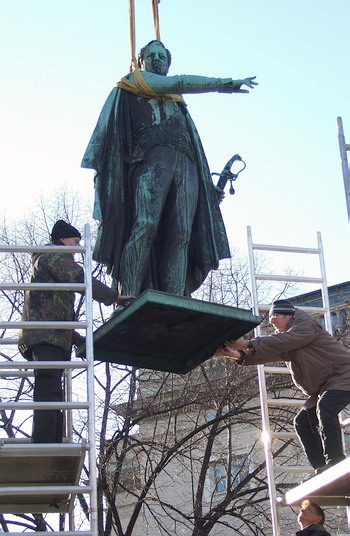 Während am 9. Januar 2008 Yorck von Wartenburg und Gneisenau, an dicken Seilen hängend, mit einem Kran auf einen Tieflader gehoben und nach Adlershof gefahren wurden, bleibt das Blücher-Denkmal stehen, weil es wegen seiner Größe und Konstruktion nicht demontiert und transportiert werden kann. Daher wird das 1822 eingeweihte Monument, das den nach vorwärts stürmenden Blücher ehrt, demnächst in einem provisorischen Labor aus Plastikplanen einer Verjüngungskur unterzogen, wie Metallrestaurator Bernd Helmig erklärt. Er und seine Kollegen werden bei allen drei Standbildern die grün patinierte, durch schwarze Schlieren verunstaltete Bronze mit Skalpell und Bürsten von dicken Schmutzkrusten befreien und ihnen eine Wachsschicht verpassen, die sie vor Wind und Wetter sowie vor Attacken durch Graffiti-Schmierer schützt.
