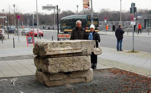 Steine, die von Hitlers Reichskanzlei stammen sollen, sind unweit des Denkmals für die von den Nationalsozialisten ermordeten Juden Europas aufgestellt. Sie machen auf die noch bis Jahresende laufende Ausstellung „Mythos Germania“ aufmerksam. Die Bruchstücke wurden 2008 bei Erdarbeiten im Vorfeld von Neubaumaßnahmen an der Ecke Ebertstraße/Voßstraße freigelegt und als Gesimse beziehungsweise als Umrahmungen von Fenstern von Hitlers Neuer Reichskanzlei gedeutet. Dieses nach Plänen von Albert Speer ab 1938 errichtete Herrschaftsgebäude von erstaunlicher Dimension hatte den Zweiten Weltkrieg nur als Ruine überstanden und wurde danach dem Erdboden gleich gemacht. Dabei hat man vielfach die Bunker und andere im Erdreich verborgene Unterkünfte zugeschüttet. Eine Informationstafel vor dem Ausstellungspavillon an der Gertrud-Kolmar-Straße weist darauf hin, dass bei weiteren Erdarbeiten weitere Entdeckungen dieser Art möglich sind.