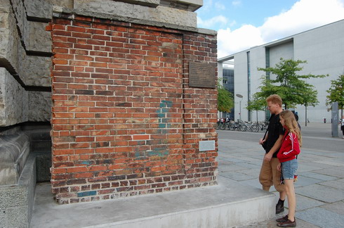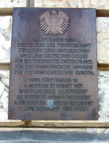 Ein paar Schritte vor diesem ebenso schlichten wie eindrucksvollen Denkmal ist in die Wand des Reichstagsgebäudes eine Bronzetafel eingelassen. Der deutsche und ungarische Text würdigt den Anteil des ungarischen und des deutschen Volkes vor 20 Jahren am Kampf für ein vereinigtes Deutschland, für ein unabhängiges Ungarn und ein demokratisches Europa. Auf der Tafel wird der 10. September 1989 hervorgehoben, jener Tag, an dem ungarische Soldaten bei Sopron begannen, den Stacheldraht zwischen ihrem Land und Österreich zu zerschneiden und damit die Öffnung des Eisernen Vorhangs einleiteten. Die Aktion stieß bei der SED- und DDR-Führung auf äußerste Missbilligung und veranlasste sie zu vergeblichen diplomatischen Vorstößen in Budapest.