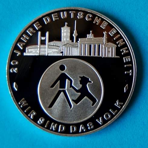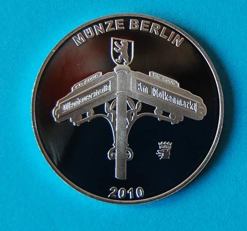 Die Staatliche Münze Berlin hat das neue Jahr mit der Prägung einer originellen Silberprägung eingeläutet. Die dem 20. Jahrestag der deutschen Wiedervereinigung gewidmete Jahresmedaille 2010 in der Größe und dem Gewicht eines Zehn-Euro-Stücks zeigt auf der Vorderseite markante Gebäude in der Hauptstadt, und zwar das Olympiastadion, das Rote Rathaus, den Fernsehturm, das Brandenburger Tor und die Siegessäule, darunter fassen sich einem Kreis die allseits bekannten Ampelmännchen West und Ost freundschaftlich an den Händen. Münzdirektor Andreas Schikora erläuterte das durch den Ruf vom Herbst 1989 WIR SIND DAS VOLK kommentierte Bild als ein treffendes Symbol für das im Großen und Ganzen friedlich verlaufene Zusammenwachsen beider Teile Berlins und unseres 40 Jahre geteilten Landes. Auf der Rückseite sind zwei Straßenschilder, und zwar das Ollenhauerstraße im Bezirk Reinickendorf und das des Platzes Am Molkenmarkt, zu erkennen. Sie erinnern daran, dass die Staatliche Münze Berlin ursprünglich in einer großen Geldfabrik aus den 1930-er Jahren untergebracht war und 2006 an einen anderen, für ihre Arbeit viel besseren Standort in einer ehemaligen Glasfabrik an der Ollenhauerstraße 97 umgezogen ist.