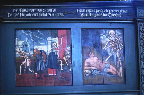 Wie man in der Petrikirche erfährt, hingen die Bilder mit Sprüchen wie „Mit Pauk’ und Trompetenschall / der Tod sich anmeldt ueberall“, „Der Weisen Kunst, des Narren Spiel / Nichts hilft es, es gilt dem Toten gleich viel“, „Kein Weibsbild ist so hoch geboren / Es muss dran, taet’s ihr gleich zorn’“ oder „Der Kaiser und das Roemisch Reich / Und wer mehr drin, muß sterben gleich“ ursprünglich an einem anderen Ort. Da Sankt Petri so viel von seinem ursprünglichen Schmuck verloren hatte, hat man die Bilder von der außerhalb der mittelalterlichen Stadtmauer gelegenen und als Begräbniskapelle eines Hospitals genutzten Gertrudenkapelle in die Petrikirche gebracht und ihnen damit größere Aufmerksamkeit verschafft. Zwar wurden die Bilder um 1700 gemalt, doch schildern sie nicht die Gegenwart des Reeders Köppe, sondern zeigen Motive aus einer vergangenen Epoche. Die Männer, Frauen und Kinder tragen Kostüme der Renaissancezeit und leben in einem Umfeld, in dem auch Wolgast und sein herzoglicher Hof eine glänzende Rolle spielte. Vergangene Zeiten – in Sankt Petri werden sie trotz der grusligen Zutaten noch einmal lebendig. Wer für solche Botschaften empfänglich ist, sollte dort einen Besuch unbedingt einplanen.