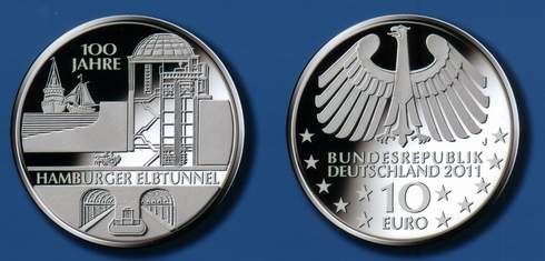 Wer sich für die Geschichte des Verkehrswesens interessiert und entsprechende numismatische Belegstücke sammelt, kann sich auf das Zehn-Euro-Stück „100 Jahre Hamburger Elbtunnel“ freuen. Sie wird in der Hamburger Münze, kenntlich am Buchstaben J auf der Adlerseite, nach einem Entwurf von Herwig Otto hergestellt. Die vollständige und harmonische Darstellung des Elbtunnels von Sankt Pauli nach Steinwerder und zurück zeige die Lage am Strom, das Schachtbauwerk mit Tunnelanschluss, die beiden Röhren sowie die darüber laufende Schifffahrt. Die Anordnung der einzelnen Bestandteile des Gesamtbauwerks und die Funktion des Schachtgebäudes seien detailgetreu und trotzdem klar und übersichtlich aufgezeigt. Dass der Künstler eine winzige Kutsche in der Röhre fahren lässt, erinnert daran, dass vor hundert Jahren zunächst Pferdekutschen und -fuhrwerke das Meisterwerk der Ingenieurskunst frequentiert haben. Erst später kamen Automobile hinzu.