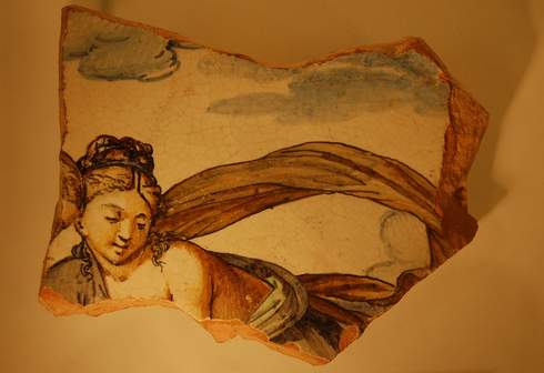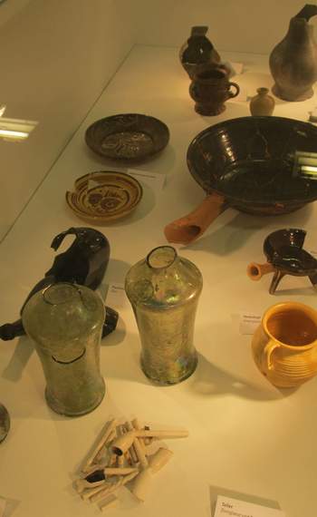 ergänzt durch eine Vitrine mit beispielhaften Fundstücken aus Keramik, Glas