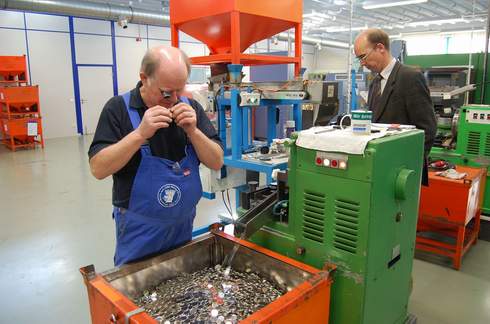 Die Euro-Münzen erhalten Randschriften und Randmarkierungen als untrügliches Echtheitsmerkmal. Fälscher schaffen es kaum, die vertieften Buchstaben und Zeichen so nachzuahmen, dass es keinem auffällt. Da die vor zehn Jahren eingeführten Geldstücke zu einem und zwei Euro Bimetallmünzen sind, also aus einem Ring und einer Pille bestehen, wie man in der Geldfabrik sagt, werden die beiden Teile in einer speziellen Maschine fest zusammengefügt. Beim anschließenden Prägen erhalten sie auf beiden Seiten ihre Bilder. Die eigentliche Prägung ist der krönende Akt in einer langen Kette von komplizierten Vorarbeiten. Sie erfolgt blitzschnell, denn eine moderne Prägemaschine schafft 750 Stück in der Minute, die mit leisem Scheppern in eine große Kiste fallen, um dann automatisch gezählt, eingewickelt und zum Versand fertig gemacht zu werden.