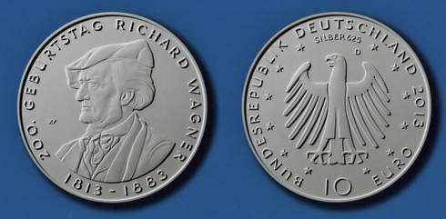 Nachdem 2012 eine aus Silber beziehungsweise Neusilber bestehende Zehn-Euro-Münze „200 Jahre Märchen der Brüder Grimm“ mit dem Doppelbildnis der berühmten Sprachwissenschaftler und Märchensammler Jacob und Wilhelm Grimm gewürdigt hatte, wird es 2013 eine Fortsetzung mit Schneewittchen als Motiv geben. Das Bundesamt für zentrale Dienste und offene Vermögensfragen (BADV) organisiert derzeit den künstlerischen Wettbewerb. Sodann können wir uns auf eine Sonderausgabe zu zehn Euro „150 Jahre Rotes Kreuz“ sowie zum 200. Geburtstag des Komponisten und Begründers der Bayreuther Festspiele Richard Wagner freuen. Hier ist schon das von Erich Ott gestaltete und mit dem ersten Preis bedachte Bildnis des Künstlers mit Samtbarett bekannt.
