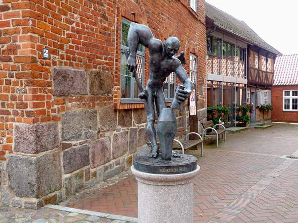 In der mecklenburgischen Kleinstadt Gadebusch südwestlich von Wismar kann man zuschauen, wie ein kräftig gebauter Münzarbeiter solche Geldstücke hergestellt hat. Die von dem Bildhauer Wolfgang Knorr geschaffene Bronzeskulptur rechts neben dem Rathausportal erinnert daran, dass Gadebusch, eine der ältesten Städte des heutigen Bundeslandes Mecklenburg-Vorpommern, auf eine lange, ins 13. Jahrhundert zurückreichende Münzgeschichte blickt. Die Münzknechte bedienten sich einer urtümlichen Prägeweise, bei der die auf dem gravierten Unterstempel liegende Ronde, auch Schrötling genannt, durch kräftige Hiebe auf den mit der linken Hand festgehaltenen Oberstempel in eine Münze verwandelt wurde.