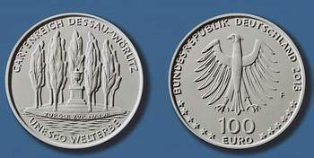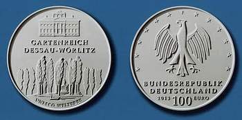 Die im Jahr 2003 begonnene Serie deutscher Goldmünzen zu einhundert Euro wird 2013 mit einer Ausgabe fortgesetzt, die das auf der Unesco-Liste des Weltkulturerbes vermerkte Dessau-Wörlitzer Gartenreich würdigt. Damit ist das Bundesland Sachsen-Anhalt erneut auf einer deutschen Gedenkmünze verewigt. Vorausgegangen waren 1998 die Franckeschen Stiftungen in Halle an der Saale auf einem silbernen Zehn-Mark-Stück, 2003 die von der Unesco zum Welterbe erhobene Stadt Quedlinburg auf einer goldenen Hundert-Euro-Münze sowie 2004 das Bauhaus in Dessau, das ebenfalls den Welterbetitel trägt, auf einem silbernen Zehn-Euro-Stück. Außerdem wurden 2005 Magdeburg und 2008 die berühmte Himmelsscheibe von Nebra 2008 durch Zehn-Euro-Stücke gewürdigt. Die archäologische Sensation war 1999 auf dem Mittelberg bei Nebra im Burgenlandkreis entdeckt worden und wird heute im Landesmuseum für Landkreis Vorgeschichte in Halle an der Saale gezeigt.