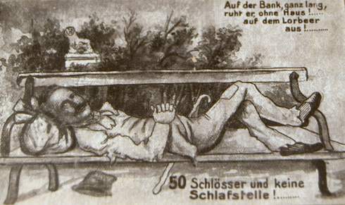 Es versteht sich, dass nach dem Ende des Krieges der ins holländische Exil geflüchtete Kaiser Wilhelm II. ein besonderes Ziel der Karikaturisten im In- und Ausland war. Sorgsam im Geheimen Staatsarchiv eingeordnet, lassen die Spottbilder den Hohenzollernherrscher auf sein ganz normales Maß schrumpfen, doch sie zeigen auch, wie er und seine Gemahlin sich schnell noch mit wunderbaren Lebensmitteln eindecken und die hungernden Untertanen im Stich lassen. Ausgelegt sind so genannte Huldtelegramme, in denen stramm national gesonnene Männer und Frauen ihrem Kaiser unbedingte Treue bis in den Tod versprechen. „Bravo veröffentlichen!“ schrieb der Kaiser unter ein Telegramm, in dem der Deutsche Frauenbund 1917 dem Reichsoberhaupt mit Blick auf eine Friedensinitiative des amerikanischen Präsidenten Wilson versicherte: „wilsons taeppischer griff in die volksseele weckt uns. hellauf flammt von neuem der geist von 1914 und millionen haende heben sich zu neuem treueschwur auch wir halten durch“.
