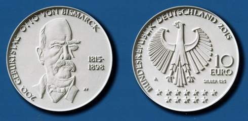 Wenn die Bundesregierung im Jubiläumsjahr 2015 eine Zehn-Euro-Gedenkmünze aus Silber beziehungsweise Neusilber mit Bismarcks Bildnis herausgibt, dann ist sie sich bewusst, dass der Spross aus einer altmärkischen Adelsfamilie eine umstrittene Person war. Der durch zahllose Denkmäler und auf Medaillen verherrlichte Bismarck verdient es, dass man sich mit ihm auch heute kritisch auseinandersetzt. Das haben die anlässlich eines künstlerischen Wettbewerbs eingereichten Münzentwürfe getan. Die Designer konnten aus dem reichen Fundus an Bismarck-Bildnissen schöpfen, und die meisten zeigen den Kanzler im Profil. Lediglich der Siegesentwurf von Michael Otto bildet den markanten Kopf von vorn ab. Sein Bismarckporträt verdeutlicht nach Meinung des Preisgerichts „in eindrucksvoller Weise die Ambivalenz, die mit der Persönlichkeit Bismarcks verbunden ist. Bismarck war kein einfacher Mann; er verkörperte beides: Tradition und Moderne“. Dem Künstler gelinge es, diese Komplexität der Person in einer sehr eigenständigen Arbeit umzusetzen. Der Entwurf fordere den Betrachter zur Auseinandersetzung mit diesem Staatsmann auf und biete interpretatorischen Spielraum, urteilt die Jury und fügt hinzu: „Die En-Face-Ansicht ist handwerklich fein ausmodelliert. Die Umschrift schafft eine harmonische formale Klammer zwischen Bild- und Wertseite. Das würdig dargestellte Hoheitszeichen wird optisch getragen von einer Basis, die von den Europa symbolisierenden Sternen gebildet wird.“