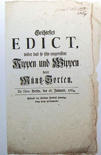 Dass die Kipperei in Preußen zur Regierungszeit Friedrichs des Großen nicht aus der Welt, sondern auch im Sprachgebrauch allgegenwärtig war, zeigt ein am 16. Januar 1764 von Friedrich II. erlassenes Edikt. Zunächst stellt der König fest, dass ungeachtet vielfältig ergangener heilsamer Edikte und Verordnungen das höchstschädliche Kippen und Wippen eingerissen sei. Er verweist auf ein älteres Edikt vom 18. May 1763., wonach nur das dort vermerkte Geld mit vorgeschriebenem Gewicht angenommen werden soll. Er, der König, habe aufs Neue höchst missfällig wahrgenommen, „wie obgedachtes Kippen und Wippen seit einiger Zeit dergestalt überhand genommen, daß das Gewicht nicht nur von denen Sächsischen und anderen geringhaltigen reducirten Geldern, sondern auch sogar von denen unter Unserm höchsteigenen Stempel ausgeprägten alten und neuen Müntz Sorten so starck differiret, daß von denen Geld-Beuteln, welche bey Unsern Cassen einkommen, fast keiner mehr das gehörige Müntz Gewicht hat, und öfters einige Marck daran manquirten“. Der König meinte, dass in seinem Reich nicht nur auswärtige Münzen mit geringem Schrot und Korn umlaufen, sondern auch preußische Nominale den Vorschriften nicht entsprechen. Interessant ist der Hinweis auf Geldbeutel, die einen bestimmten Betrag enthalten sollten, dies aber offensichtlich nicht taten und zu leicht waren. Da aber niemand wissen wollte, was in den versiegelten Beuteln wirklich steckt, gingen sie bei der Begleichung von größeren Summen ungeöffnet von Hand zu Hand. Wer die Behälter irgendwann öffnete und nachzählte, hatte durch die Einbuße das Nachsehen.