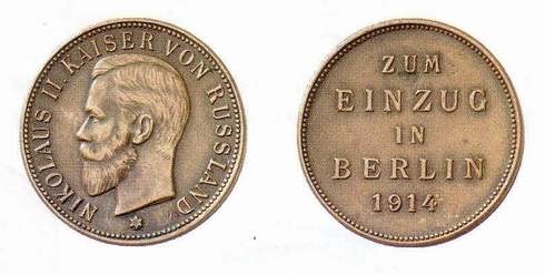 Kriege wurden schon immer durch Propaganda und Gegenpropaganda begleitet. Kaum ein Waffengang der neueren Geschichte, der nicht auch auf geprägtem Metall dokumentiert wurde. Schaut man sich die Münzen und Medaillen genauer an, dann lernt man manche Stücke kennen, deren Urheber sich im Hintergrund hielten. Da gibt es eine Medaille von 1914 mit dem Kopf von Zar Nikolaus II. und der Aufschrift „Zum Einzug in Berlin“. Bei ihr ist nicht zu erkennen, wer der Auftraggeber und/oder Hersteller war. Ich vermute, sie ist in vorauseilendem Gehorsam und in Erwartung des russischen Einmarschs in Berlin gleich nach dem Beginn des Ersten Weltkriegs vor hundert Jahren geprägt wurde. Der Zarenkopf ähnelt dem Kopf auf den russischen Rubelstücken, die Inschrift auf der Rückseite drückt die Erwahrung der politischen und militärischen Führung in Sankt Petersburg aus, mit den anderen Staaten der Entente binnen kurzer Zeit das Deutsche Reich und seine Verbündeten niederwerfen zu können.