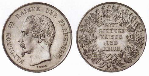 Die Medaille eines anonymen Herstellers von 1914 erinnert an eine undatierte Medaille mit dem Kopf des französischen Kaisers Napoleon III. mit der Aufschrift „Gott schütze Kaiser und Reich“. Sie ist in dem Katalog von Paul Joseph und Eduard Fellner über die Münzen von Frankfurt am Main unter der Nummer 1844 a vermerkt. Im Kommentar schreiben die Autoren, die Medaille aus Silber und Bronze sei Anfang der 1860-er Jahre auf Veranlassung des in Mainz wohnenden Stempelschneiders F. Korn in der Frankfurter Münze in wenigen Exemplaren geprägt worden, jedoch habe der Senat die Prägung sofort einstellen lassen. „Korn wollte, nach einer uns [bekannt] gewordenen Mitteilung, das Stück benutzen, um sich bei Napoleon III. zu empfehlen. Gewicht und Grösse stimmen genau mit den damaligen Doppelthalern; auch der Eichkranz ist diesen nachgebildet“. Das Beispiel zeigt, dass Münzen und Medaillen da und dort in den Dienst fremder Herrschaftsinteressen gestellt wurden, und wenn man weiter sucht, wird man bestimmt weitere Beispiele finden.