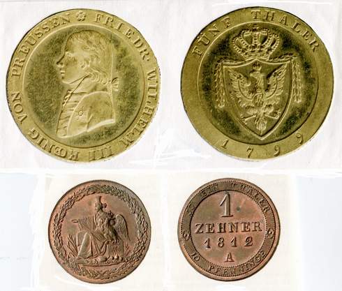 Eröffnet werden die Kapitel durch die Taler und Doppeltalern; es folgen deren Teilstücke bis hinunter zu Kupfergeld sowie zum Abschluss die Goldmünzen vom Friedrichsdor bis zur Krone. Erfasst sind die Geldstücke aus den preußischen Münzstätten, die für die gesamte Monarchie beziehungsweise einzelne ihrer Provinzen tätig waren und an bestimmten Buchstaben zu erkennen sind, und zwar Berlin (A), Breslau, Bayreuth, Glatz und Hannover (B), Frankfurt am Main (C), Düsseldorf (D), Königsberg (E) und Glatz (G). Darüber hinaus enthält das Buch Informationen über die zum Wiegen von Goldmünzen verwendeten Messinggewichte, aber auch über das in den Münzstätten tätige Leitungspersonal und die ihm ausgezahlten Gehälter. Zu den im Handel ab und zu angebotenen Probeprägungen und einseitigen Abschlägen verweist Olding auf die Bestände des Münzkabinetts der Staatlichen Museen zu Berlin Preußischer Kulturbesitz und eine Publikation von Elke Bannicke in den „Beiträgen zur Brandenburgisch/Preußischen Numismatik, Heft 5, Berlin 1998“. Die meisten Proben befanden sich in der Sammlung der Königlichen, ab 1918 Staatlichen Münze Berlin, doch sie sind seit dem Kriegsende 1945 spurlos verschwunden. Diese Exemplare können nur in Schwarz-Weiß-Fotos abgebildet werden; die Farbfotos wurden nach den Beständen des Münzkabinetts aufgenommen. Der neue Olding-Katalog ist eine hervorragende Arbeit, die den Ansprüchen der Sammler und Münzforscher, die ja oft beides in einem sind, sowie des Handels vollauf genügt. Sollte der Verfasser weiter mit einem weiteren Buch in die Vergangenheit zurück gehen wollen, dann böten sich die Münzen vom Großen Kurfürsten Friedrich Wilhelm, vom Kurfürsten und König Friedrich III./I. und vom König Friedrich Wilhelm I. an. Zwar gibt es dazu eine sehr gute Fachliteratur, ein Olding-Katalog fehlt aber noch.