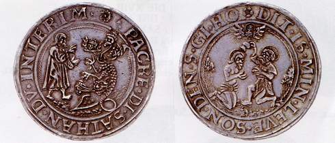 Im Verlauf ihrer langen Geschichte hat die Stadt Magdeburg verschiedene Gedenk- oder Schaumünzen geprägt, um ihre Ansprüche auf ihre Reichsfreiheit zu betonen, auf ihre ruhmreiche Vergangenheit hinzuweisen und ihre Treue zur Lutherschen Lehre zu unterstreichen. Der in verschiedenen Varianten geprägte Interimtaler von 1549 greift mit dem Spruch PACKE DI SATHAN DV INTERIM das Augsburger Interim an. Die Interim genannte Zwischenzeit wird durch ein dreiköpfiges Ungeheuer, den Satan, symbolisiert, das vergeblich gegen Jesus Christus anzukämpfen versucht. Die Taufe des Heilands auf der Rückseite der Magdeburger Münze wird von einem plattdeutsch formulierten Spruch DIT IS MIN LEVE SON DEN S GI HO umschlossen. Kaiser Karl V. hatte nach dem Sieg über den Schmalkaldischen Bund (1547) versucht, seine gegen das Lutheranertum gerichteten religionspolitischen Ziele durchzusetzen. Das Augsburger Interim wurde von protestantischer Seite abgelehnt, wobei sich Magdeburg durch besonderen Eifer hervortat. Doch auch die Katholiken waren mit der Verordnung unzufrieden. Lange konnte sich der Kaiser seines Sieges nicht erfreuen, denn schon 1552 musste er nach einem Aufstand protestantischer Fürsten das Interim zurücknehmen und die konfessionelle Spaltung des römisch-deutschen Reiches akzeptieren.