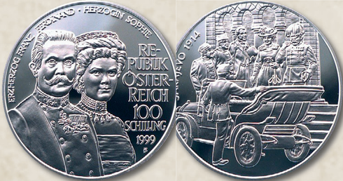 Die Republik Österreich entschloss sich 1999, den „ersten Opfern des Weltkriegs 1914 bis 1918“, wie es auf einer Erinnerungstafel in der Wiener Kapuzinergruft, der Grablege der Habsburger, heißt, eine Gedenkmünze im Wert von 100 Schilling zu widmen. Von Thomas Pesendorfer nach historischen Vorlagen gestaltet, zeigt das Silberstück auf der Vorderseite das Bildnis des Thronfolgerpaars und auf der Rückseite jenen Augenblick, als es das Rathaus in Sarajewo verlässt und sich zu dem Automobil begibt, auf das die tödlichen Schüsse abgegeben wurden. Die Münze gehört zu der 1997 aufgelegten Serie „Schicksale im Hause Habsburg“, die der 1793 in Frankreich hingerichteten Königin Marie Antoinette, einer Tochter von Kaiserin Maria Theresia, und dem 1867 in Mexiko erschossenen Kaiser Maximilian, einem jüngeren Bruder von Kaiser Franz Joseph, gewidmet ist. Weitere Münzen erinnern an Kronprinz Rudolf, der 1889 mit seiner Geliebten Baronin Mary Vetsera Selbstmord beging. Durch dieses Ereignis rückte der junge Franz Ferdinand in der Thronfolge auf. Die Serie ehrt schließlich die 1898 in Genf ermordete Kaiserin Elisabeth, genannt Sisi oder Sissi, sowie Karl I., der nach dem Tod von Franz Joseph 1916 dessen Nachfolger wurde und der letzte Kaiser der Habsburgermonarchie war.