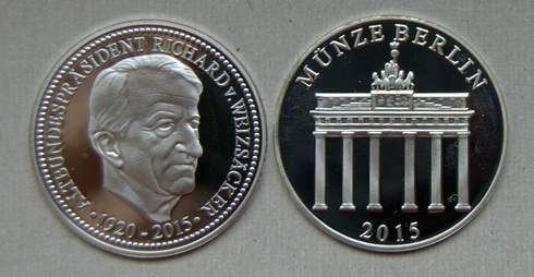 Die Staatliche Münze Berlin widmet dem am 31. Januar 2015 im Alter von 94 Jahren verstorbenen Altbundespräsidenten Richard von Weizsäcker eine von Kerstin Schubert und Stefanie Lindner gestaltete Silbermedaille. Sie kann im Shop der Prägeanstalt an der Ollenhauerstraße 97 in Berlin-Reinickendorf für 14 Euro gekauft werden (Tel. 030/231 40 638). Geschmückt mit dem Kopf des Politikers und dem Brandenburger Tor, erinnert sie daran, dass der studierte Jurist von 1981 bis 1984 Regierender Bürgermeister von Berlin und von 1984 bis 1994 deutscher Bundespräsident war. Er wurde am 11. Februar 2015 mit einem Staatsakt im Berliner Dom geehrt und danach auf dem Waldfriedhof im Berliner Ortsteil Dahlem bestattet. An Weizsäckers nur mit der Bundesfahne und einem Kranz der Familie geschmückten Sarg sagte Bundespräsident Joachim Gauck unter der Kuppel des Berliner Doms: „Im Grundgesetz ist nicht vorgeschrieben, dass ein Bundespräsident eine moralische Instanz zu sein hat. Es ist auch nicht vorgeschrieben, dass er intelligent sein, der sittlichen Vernunft folgen und auch noch durch gute Reden überzeugen können soll. Aber Richard von Weizsäcker hat dies alles beherrscht und gelebt – souverän, freundlich und selbstverständlich. Er hat damit Maßstäbe für das Amt gesetzt. In tiefer und großer Dankbarkeit tragen wir ihn jetzt hier in Berlin zu Grabe, in der Stadt, die auch durch seinen leidenschaftlichen Einsatz die Hauptstadt eines vereinten Deutschlands geworden ist. Wir verneigen uns vor Richard von Weizsäcker, einem großen Bundespräsidenten, der, als es an ihm war, das Richtige sagte und das Richtige tat.“