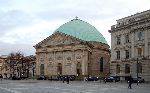 Beim Wiederaufbau der Kirchenruine von 1956 bis 1963 wurde die barocke Außengestalt aus dem 18. Jahrhundert wiederhergestellt. Die Kuppel erhielt eine vereinfachte Form ohne die hohe Laterne aus der Kaiserzeit. Im Inneren schuf der Architekt Hans Schwippert eine Ober- und eine Unterkirche, die durch eine offene Stelle und eine Treppe verbunden sind. Die Unterkirche dient als Begräbniskapelle für Berliner Bischöfe, und hier wird auch des 1943 von den Nazis wegen seines Widerstandes ermordeten Dompropstes Bernhard Lichtenberg gedacht. Der Geistliche hatte den Massenmord der Nationalsozialisten an Kranken und so genannten Lebensunwerten verurteilt und war der Verbreitung von Gräuelpropaganda und des Kanzelmissbrauchs bezichtigt worden.