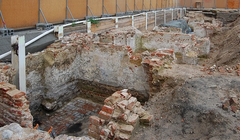 Im Erdreich gut zu erkennen sind Reste des historischen Rathauses, das dem heutigen Verwaltungsbau mit dem riesigen Turm vorausging. Da Löcher im Erdreich und Keller schon immer auch als Abfallgruben für Glas und Keramik, Speisereste und Schutt benutzt wurden, konnten die Spezialisten vom Landesdenkmalamt zahlreiche Relikte dieser Art freilegen. Das tun sie vorsichtig mit Pinsel und Spachtel, und was zutage tritt, wird sorgsam zeichnerisch und fotografisch dokumentiert sowie restauriert. Dass man im alten Berlin gern und viel getrunken hat, verraten zahlreiche zerborstene Flaschen und Gläser. Ihre Herkunft aus märkischen Manufakturen kann man gut an den Glasmarken erkennen.