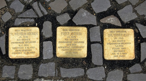Vor dem Gebäude des Oberverwaltungsgerichts Berlin-Brandenburg in der Hardenbergstraße 31 wurden vor kurzem Stolpersteine zur Erinnerung an Richter verlegt, die nach 1933 dem nationalsozialistischen Rassenwahn zum Opfer fielen. Bald nach der Errichtung der Hitler-Diktatur wurden aus dem damaligen Preußischen Oberverwaltungsgericht 14 Richter aus rassischen oder politischen Gründen aus ihrem Amt vertrieben. Die Metallplatten rufen Fritz Citron ins Gedächtnis zurück, der sich 1938 das Leben nahm, Ernst Isay starb 1943 im brasilianischen Exil, und Wilhelm Kroner wurde 1942 im KZ Theresienstadt ermordet. Acht andere Richter wurden 1933/4 auf Regierungsratsstellen in der Provinz versetzt. Drei weitere gingen in den Ruhestand, um ihre Degradierung abzuwenden.