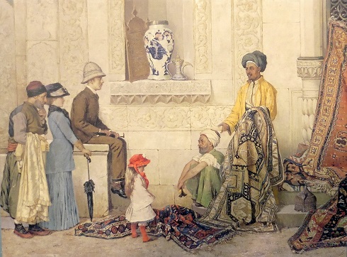 Der mit Sarre befreundete Maler Osman Hamdi Bey schildert auf dem Gemälde von 1888 den Besuch des Orientalisten bei einem persischen Teppichhändler. Repro: Staatliche Museen zu Berlin