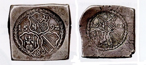 Wie die Landauer Klippen sind auch andere Belagerungsmünzen begehrte Sammelstücke, und manche sind ausgesprochene numismatische Raritäten, die uns viel von Kriegen in vergangenen Zeiten erzählen. Zu diesen Sonderlingen gehören Straßburger Talerklippen aus dem Jahr 1592. Die Achtzig-Kreuzer-Stücke und kleinere Werte sind einseitig mit drei Wappen in einem Lorbeerkranz geschmückt. Sie erinnern an einen bewaffneten Streit, den die mehrheitlich protestantische Bürgerschaft mit dem in der Stadt residierenden Fürstbischof ausfocht. Es kam sogar zur Doppelwahl eines protestantischen und eines katholischen Bischofs. Die hier vorgestellte Klippe vereinigt das Wappen des Protestanten Johann Georg von Brandenburg mit dem der Stadt und dem Domkapitel. Der Streit um die Macht dauerte mehrere Jahre und forderte viele Todesopfer. Letzten Endes konnte sich die katholische Partei im so genannten Straßburger Konkordienstreit durchsetzen, und so blieben das Fürstbistum und ein Teil seines Umlandes der katholischen Kirche verbunden. Wer sich damit nicht abfinden konnte und wollte, war gezwungen, auszuwandern und sich woanders eine neue Existenz aufzubauen. Den Straßburger Notmünzen sieht man nicht an, welche Not und welches Blutvergießen mit ihnen verbunden sind.