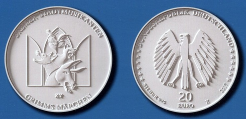 Wer in Bremen wohnt oder die alte Hansestadt besucht, wird das von dem bekannten Bildhauer Gerhard Marcks geschaffene und 1953 am altehrwürdigen Rathaus aufgestellte Denkmal der Bremer Stadtmusikanten kennen und besichtigen. Ab dem kommenden Jahr kann man die Protagonisten der von den Brüdern Jacob und Wilhelm Grimm im Jahr 1819 publizierten Geschichte mit sich herumtragen und in seine Sammlung legen, und zwar geprägt als Zwanzig-Euro-Stück. Die silberne Gedenkmünze mit dem furchtlosen, zu allem entschlossenen Esel, dem Hund, der Katze und dem Hahn ist Teil einer deutschen Münzserie mit Märchenthemen, die 2012 mit dem Doppelporträt der beiden Sprachforscher und Märchensammler begann. Inzwischen liegen die Motive Schneewittchen (2013), Hänsel und Gretel (2014), Dornröschen (2015) und Rotkäppchen (2016) vor. Neben dem Bremer Roland sind die Stadtmusikanten "das" Wahrzeichen der Hansestadt und Ausgangspunkt und Ziel der Deutschen Märchenstraße. Bremen-Sammler wird die Nachricht freuen. Sie können die neue Silbermünze zu zahlreichen Geldstücken und Medaillen legen, die man gut am Bremer Schlüssel und an anderen charakteristischen Bildern aus der Hansestadt zugehörig erkennen kann.