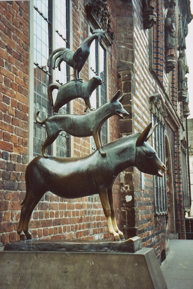 Die unterlebensgroße Bronzeskulptur der Stadtmusikanten ist neben dem Roland ein Wahrzeichen Bremens. Wenn man die Vorderbeine