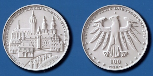 Während das Aussehen des in Berlin geprägten Silberstücks zu 20 Euro noch nicht bekannt ist, liegen die Entwürfe für die Goldmünze zu 100 Euro vor, die in allen fünf deutschen Prägeanstalten hergestellt wird. Die Jury hat den Entwurf von Bastian Prillwitz mit dem ersten Preis ausgezeichnet. Dargestellt sind auf dem Goldstück die zum Welterbe der Unesco erhobenen Luther-stätten in Eisleben, wo der Reformator 1483 geboren wurde und 1546 starb, sowie in Wittenberg, wo sich seine Hauptwirkungsstätte befand. Der Berliner Künstler kombiniert Bauwerke beider Städte und zeigt im Vordergrund Luthers Geburts- und Sterbehaus in Eisleben sowie Straßen, auf der Menschen entlang laufen. Im Mittel- und Hintergrund erheben sich majestätisch die bekannten Bau-, Kunst- und Geschichtsdenkmale in Wittenberg, und zwar die Lutherhalle, die Schlosskirche mit ihrer aus der Kaiserzeit stammenden eindrucksvollen Spitze sowie die doppeltürmige Liebfrauenkirche am Markt, an der Luther gepredigt hatte. Einbezogen ist auch die Giebelseite des Melanchthonhauses, in dem Philipp Melanchthon, Luthers engster Mitstreiter, gelebt und gearbeitet hat. "Jede einzelne Stätte ist in hochgradiger Detaillierung und beeindruckender Plastizität dargestellt. Die geschickte Komposition der Gebäudelandschaft steht nicht allein für sich, sondern wird durch eine von der Jury besonders gelobte Darstellungsebene erweitert: Es sind die Menschen von heute". In kleinen Gruppen laufend, beschäftigen sich mit dem baulichen Erbe und dem, was dort vor 500 Jahren geschehen ist. Schaut man sich andere Entwürfe und Modelle an, dann sind sie menschenleer. Das Preisgericht befand, dass die Wertseite des Prillwitzschen Modells einen kraftvollen, würdigen Adler in gelungener Modellierung zeigt.