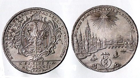 Nach Büchern über historische Orte und Unorte in Frankfurt am Main hat Frank Berger, Numismatiker und Kurator am Historischen Museum in Frankfurt, jetzt eine unterhaltsam zu lesende und informative Wegleitung zu noch existierenden Orten und solchen schon lange vergangenen Bauwerken vorgelegt, an denen in der Stadt am Main seit dem Mittelalter Münz-, Geld- und Wirtschaftsgeschichte geschrieben wurde. Das Buch "101 Geldorte in Frankfurt" erschien 2016 im Societas Verlag Frankfurt am Main, hat 215 Seiten und zahlreiche Abbildungen und kostet 12,80 Euro (ISBN 978-3-95542-186-1). Berger lädt zu einem Gang kreuz und quer durch die alte Kaiser- und Krönungsstadt ein und schlägt den Bogen von Karl dem Großen bis in die Gegenwart. Der damalige Frankenkönig und ab dem Jahr 800 römisch-deutsche Kaiser hat um 793 das Maß-, Münz- und Gewichtswesen in seinem Reich reformiert und erließ dazu in Frankfurt ein Edikt, das den Umgang mit den nach einheitlichem Standard geschlagenen Silbermünzen regelte.