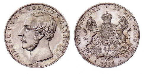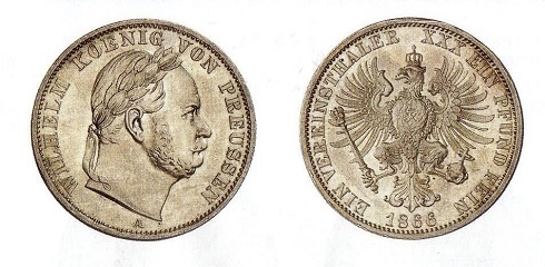 Während Wilhelm I. von Preußen nach dem Sieg über Österreich und seine Verbündeten das Ziel hatte, seine Macht auch auf Böhmen, Bayern und Sachsen auszudehnen und seine Gegner so zu schwächen, dass sie keine Gefahr für Preußen mehr bedeuten, riet Bismarck zur Mäßigung. Der Ministerpräsident sah voraus, dass sein König eines Tages Österreich sowie weitere Monarchien benötigen wird, um einen Krieg gegen Frankreich erfolgreich führen zu können. Wilhelm I. habe auf der Ausdehnung Preußens nach Westen und Süden bestanden, schrieb Bismarck später in seinem berühmten Buch "Gedanken und Erinnerungen", "um die Kluft zwischen den Ost- und Westprovinzen auszufüllen und Preußen ein haltbar abgerundetes Gebiet auch für den Fall des frühern oder spätern Misslingens der nationalen Neubildung zu schaffen." Bei der Annexion von Hannover und Kurhessen habe es sich um Herstellung einer wirksamen Verbindung zwischen den beiden Teilen der preußischen Monarchie gehandelt. Deren brandenburgisches Kernland wurde mit den Rheinprovinzen durch eine Landbrücke verbunden, die niemand mehr anzutasten wagte. Hannovers König Georg V. hatte in den Augen Bismarcks jeden Kredit verspielt. Der Welfe ging ins österreichische Exil und starb dort 1878. Sein Vermögen in Höhe von umgerechnet 48 Millionen Mark wurde beschlagnahmt und in den so genannten Welfenfonds umgewandelt, aus dessen Erträgen Bismarck "welfische Umtriebe" bekämpfte und ihm genehme Journalisten bezahlte. Kaum in Hannover eingezogen, unterbanden die preußischen Besatzer die Prägung von Münzen mit dem Bildnis und Wappen des vertriebenen Königs Georg V. Zwischen 1866 und 1878 war Hannover preußische Münzstätte, kenntlich am Buchstaben B. In Berlin wurden 1866 Siegestaler zu Ehren von Wilhelm I. geprägt. Nach antiker Manier ist der Hohenzoller im Schmuck eines Lorbeerkranzes als Sieger dargestellt. Da Auflage dieser Gedenkmünze eine halbe Million betrug, sind sie heute noch preiswert zu haben.