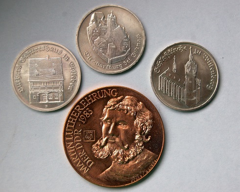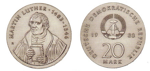 Mit einem. silbernen Zwanzig-Mark-Stück beteiligte sich die DDR 1983 am Gedenken für den vor 500 Jahren, am 10. November 1483, in der mansfeldischen Stadt Eisleben geborenen Reformator Martin Luther. Gestaltet von Heinz Rodewald, lehnt sich das Münzbildnis an zeitgenössische Porträts des streitbaren Kirchenmannes an. Die Bibel in seiner Hand deutet darauf hin, dass der Theologe unter dem Schutz des sächsischen Kurfürsten Friedrich III., des Weisen, auf der Wartburg bei Eisenach das Neue Testament ins Deutsche übersetzt und damit ein großartiges Sprachdenkmal geschaffen hat. Luther hatte sich dort als Junker Jörg einquartiert und absolvierte die Arbeit binnen weniger Wochen.