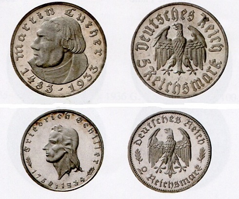 Wie Martin Luther war auch Friedrich Schiller den braunen Machthabern lieb und teuer. Sie zogen eine Linie zwischen dem Weimarer Klassiker und Menschenfreund zu Adolf Hitler, der angeblich in seiner Wiener Zeit Schillers Werke und die andere bedeutender Autoren regelrecht verschlungen haben soll. Als im November 1934 Schillers 175. Geburtstag nahte, wurde der Autor der "Räuber" und von "Wilhelm Tell", von "Kabale und Liebe" und von "Maria Stuart", der "Ode an die Freude" und der "Glocke" und vieler anderer Schöpfungen der Weltliteratur missbraucht, um dem NS-Regime Glanz und Legitimität zu verleihen. Ganz eifrige Ideologen bescheinigten Schiller eine soldatische Natur und machten ihn zu einem der Ihren. Es fehlte nur noch Schiller im Braunhemd darzustellen. Angeblich sei es dem Nationalsozialismus vorbehalten, "den wahren Friedrich von Schiller dem deutschen Volk wiederzugeben", wird im Zentralblatt "Völkischer Beobachter" aus einer in Weimar gehaltenen Hitler-Rede zitiert. Allerdings schwand die Verehrung des bluttriefenden Diktators für sein Idol im Zweiten Weltkrieg angesichts von Beifallskundgebungen im Theaterpublikum an Stellen, wo es um Freiheit und Menschenwürde geht. "Der Führer wünscht, dass Schillers Schauspiel "Wilhelm Tell" nicht mehr aufgeführt wird und in der Schule nicht mehr behandelt wird", ließ der Hitler-Vertraute Martin Bormann den Chef der Reichskanzlei Hans Lammers wissen. Tell sei nichts anderes als ein hinterlistiger Heckenschütze gewesen, außerdem betreibe die Schweiz eine unverschämte Hetze gegen das Deutsche Reich. Wer auch immer die erwähnten Münzen in die Hand nimmt, sollte um deren "Kehrseite" wissen.
